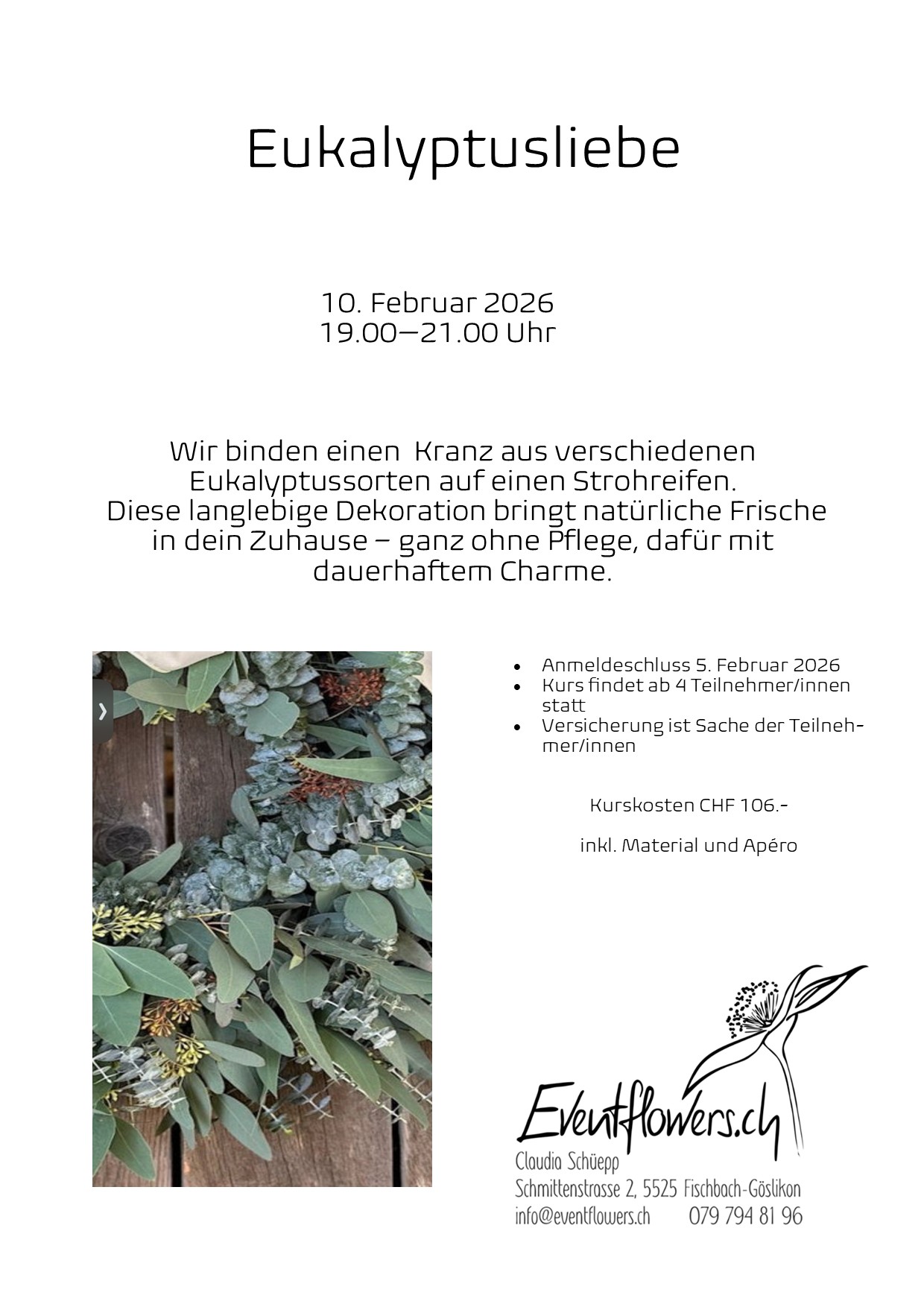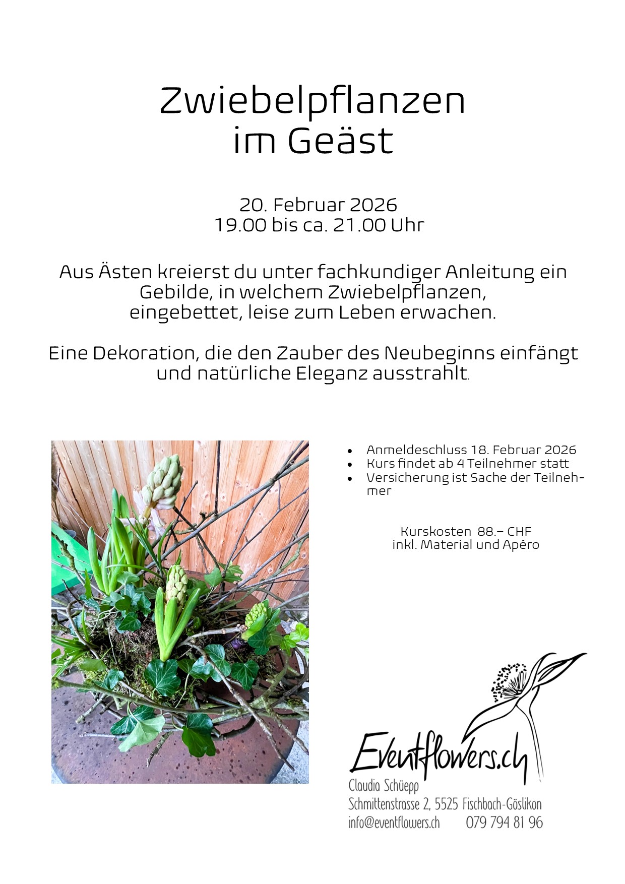 • Ort: Eventflowers.ch, Oberdorfstrasse 3, 5525 Fischbach-Göslikon