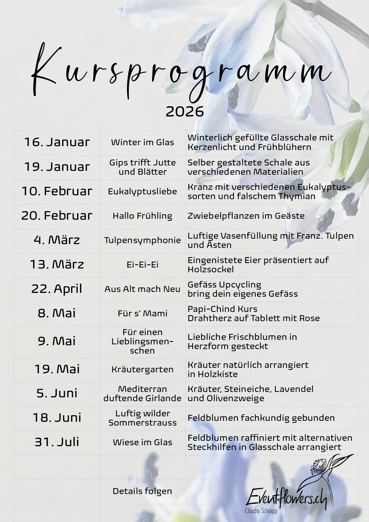 • Alle Materialien und Werkzeuge werden von Eventflowers.ch gestellt (gilt nicht für den 22.04.26).